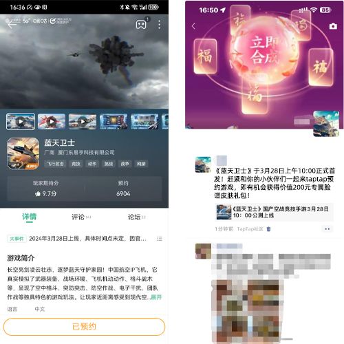 《蓝天卫士》于3月28日上午10:00正式首发!赶紧和你的小伙伴们一起来taptap预约游戏,即有机会获得价值200元专属脸谱皮肤礼包!