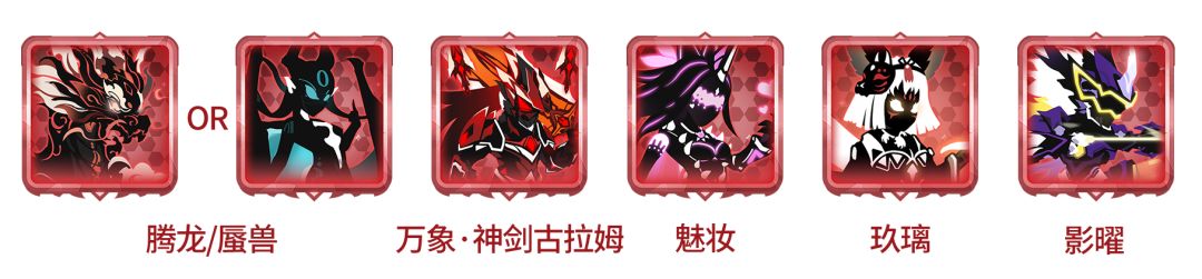 汐枫丷:主阵容:腾龙/蜃兽 + 剑主(万象·神剑古拉姆) + 魅妆 + 玖璃 + 影曜