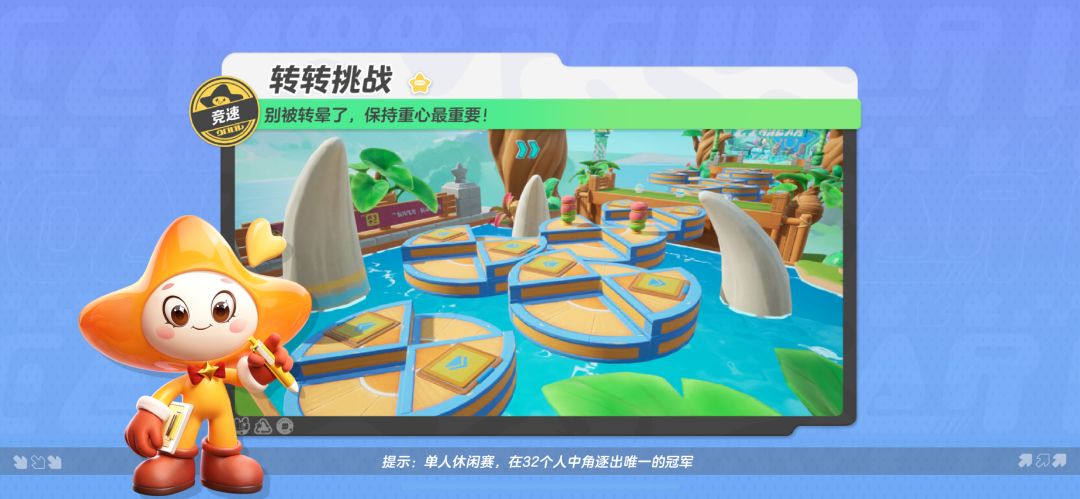 今天星妹给大家带来了一张由转盘和弹板组成的竞速地图——【转转挑战】!星宝们需要在规定时间内,穿过高低起伏、旋转移动的转盘方阵,到达终点取得胜利~