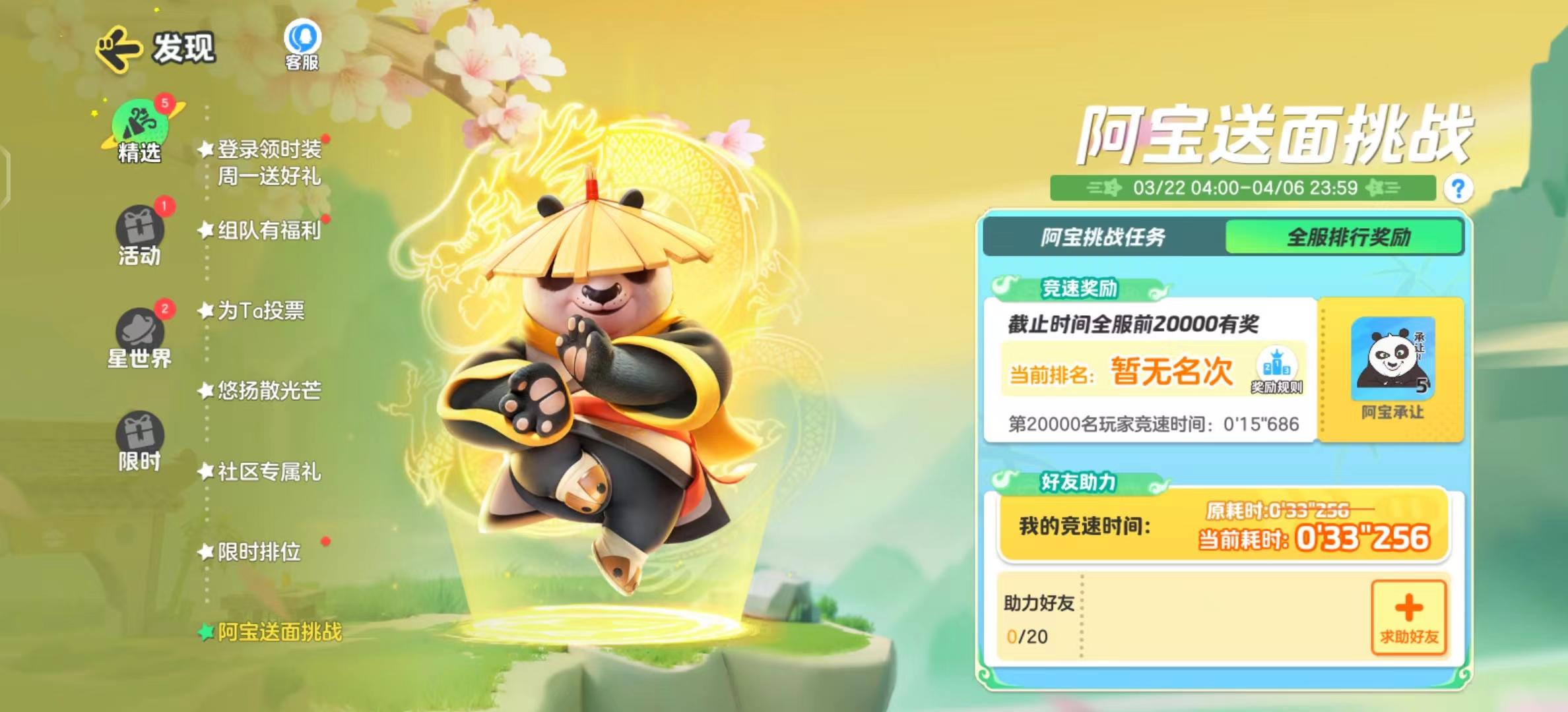 表面上星宝只是为朋友跑腿,实际上在通过梅花桩的过程中,星宝们已经悄然完成了一项修炼挑战!打开【发现-精选】活动区,进入【阿宝送面挑战】,就可以领取成功给阿宝送去汤面后的任务奖励啦~