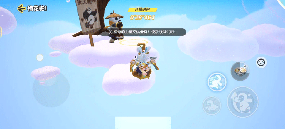 前几根梅花桩都可以利用单纯的跳跃和前扑到达,然而当梅花桩的走向出现拐弯,开始朝着阿宝所在的云朵前进时,桩与桩之间的距离会变大。这时,吃下一碗功夫汤面,神奇的力量会让星宝身轻如燕,并短暂获得浮力,轻松跳上遥远的梅花桩!