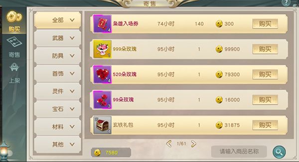 1)购买:可以查询购买其他玩家寄售的装备道具;