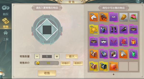 2)寄售:玩家可以在此界面寄售背包中不绑定的装备道具;