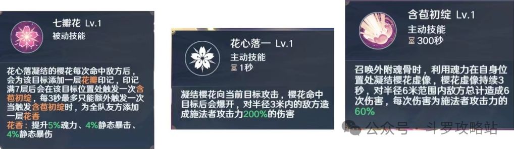 被动七瓣花:樱花命中时会添加一个花瓣标记,这个标记满7层后会在敌方位置释放一次含苞初绽,触发含苞初绽时会提升全队5%魂力,4%暴击,4%暴伤