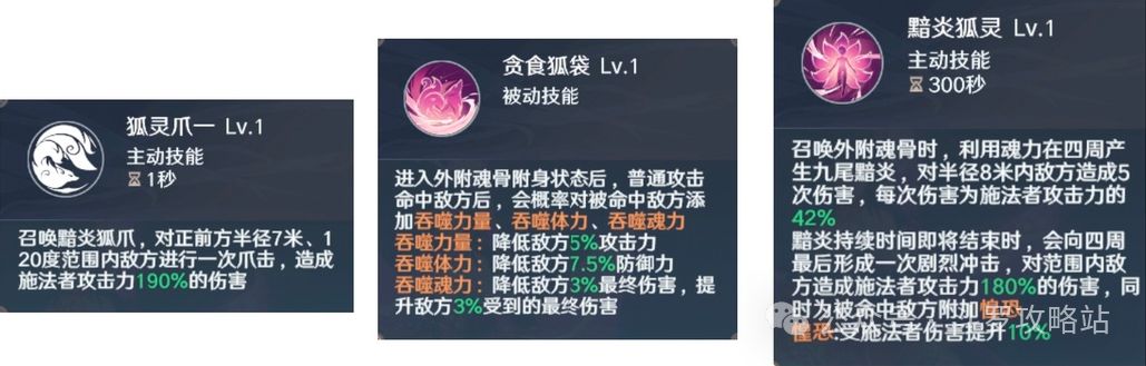 被动贪食狐袋:外附附身时普通攻击命中会概率给敌方释放吞噬力量(降低5%攻击),吞噬体力(降低7.5%防御),吞噬魂力(降低3%最终伤害和提升受到3%最终伤害)三个debuff