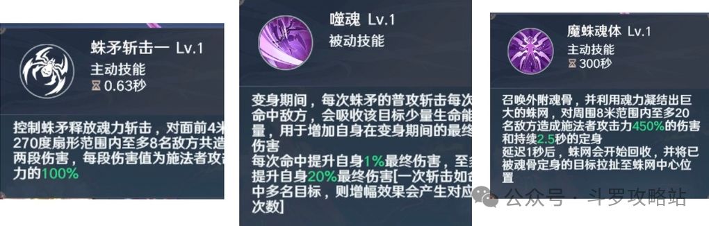 主动技能魔蛛附体:释放外附时,会释放半径8米的蛛网,蛛网内敌人会受到造成1次伤害和2.5秒的定身,1秒后蛛网把定身的敌人拉倒蛛网中心位置