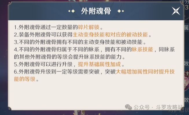 哈喽大家好!我黄大仙又来了,今天带来斗罗大陆史莱克学院攻略站第七十四封情报!上次大仙在情报尾段提到了下个版本会出的东西,其中一个就是外附魂骨,这个外附魂骨说起来陌生但也不陌生,因为在新手教程里面就有出现过外附魂骨,当时外附魂骨也就体现出伤害变高了一点,后面就没有什么别的效果了。然后大仙之前瞎点,点到了外附魂骨的页面,今天带领大家一起看一下我们未来科技外附魂骨