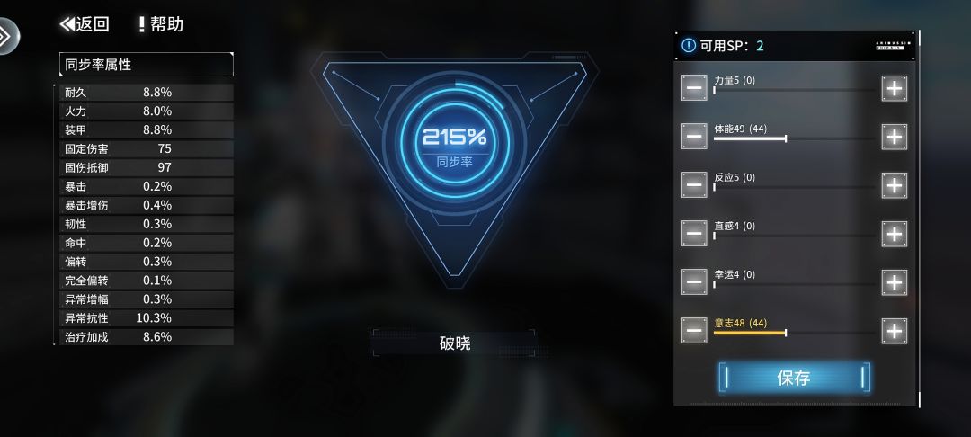同步者具有6种特质,分别是力量、体能、反应、直感、幸运和意志,这6种特质会影响艾塔的属性(具体可以看游戏内加点属性介绍)。艾塔升级获取的SP点数,可以用来强化同步者的6种特质。