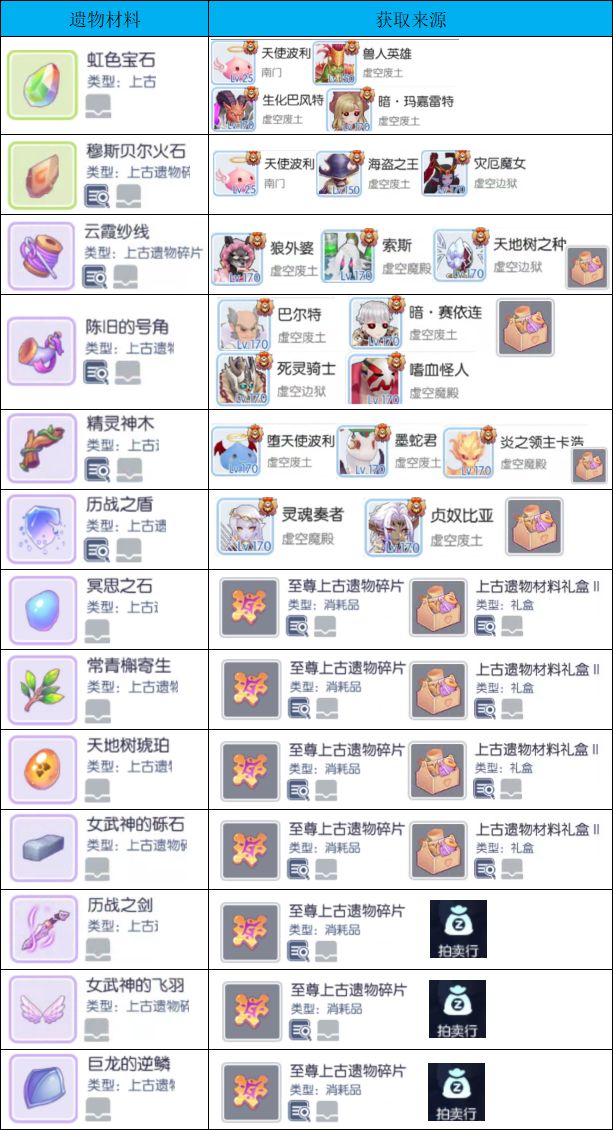 - 第四个材料为纱线、号角、神木、历战之盾,都可以通过虚空mvp获得残片合成、上古遗物结晶商店兑换(每月兑换3个)或者开至尊上古遗物碎片获得,遗物碎片可通过野外mvp(天地树之种、灵魂、章鱼、塔奥、迷梦猫妖和亡灵mvp掉落);其中历战之剑虚空boss和遗物结晶商店均无法获得只能通过开至尊上古遗物碎片和拍卖行获得