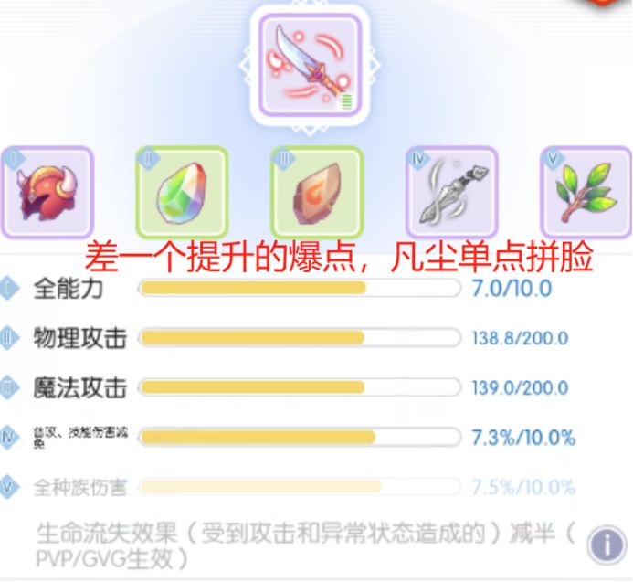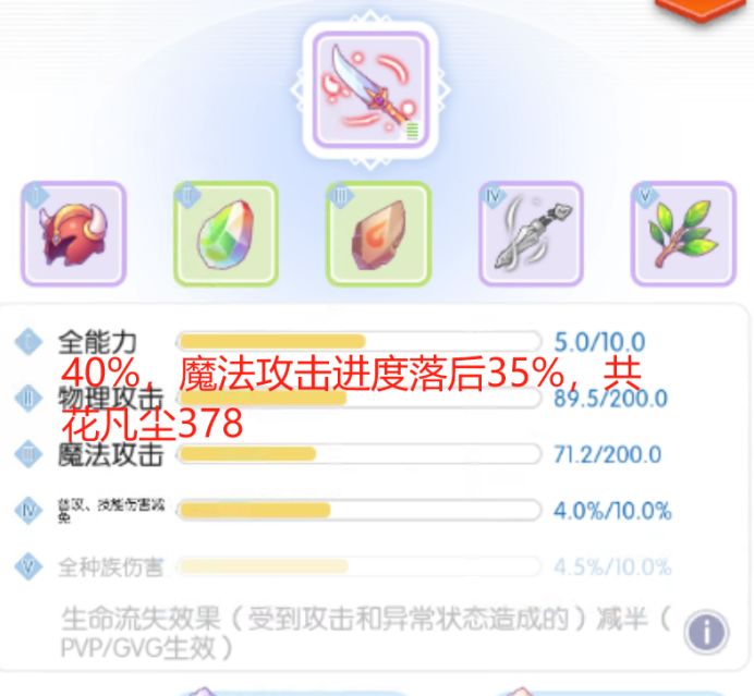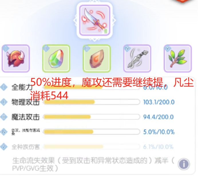 Step:凡尘单点寻找数值大提升的机会,耐心等一定会出现的,不要着急。同时在保证全能力,百分比数值项进度不低于80%的情况下,可以保存提高物攻魔攻,降低其他数值项的情况。