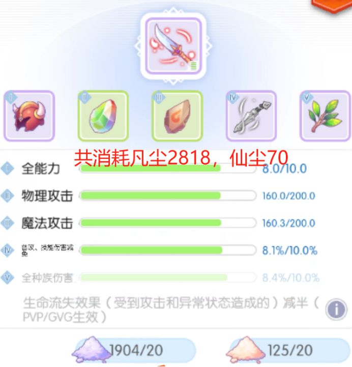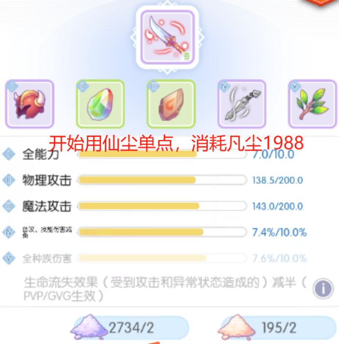 在方案一的基础上,在保证用凡尘点到全能力8+,百分比数值项进度达到7.5以上,物攻魔攻进度达到150左右的前提下,再用仙尘,可控制仙尘数量在50左右。