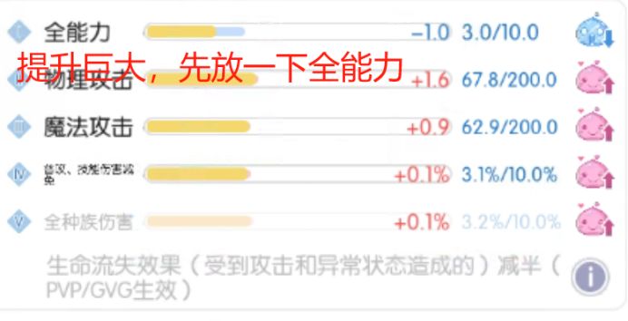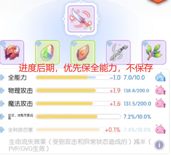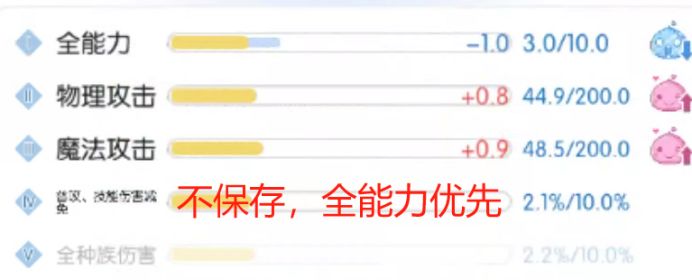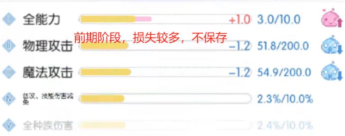 (3) 有全能力提升,然后有其他1~2项降低,整体进度接近80%,可考虑保存。如全能力+1,物攻降低,穿刺降低,此时整体进度已经到75%以上,果断保存;