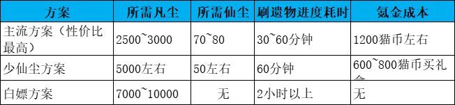 最性价比指的是综合了凡尘、仙尘消耗,需要的准备材料的时间,刷遗物的时间耐心和氪金成本的平衡。大概需要凡尘2000~3000,仙尘80左右,这种方案只需要花较少时间刷虚空凡尘,仙尘获取一般平时宴白嫖或者氪金每个月买198猫币的上古遗物典藏礼盒X10,买6个月共计1188猫币,或者买5个月+10个单独礼盒共计1240猫币。