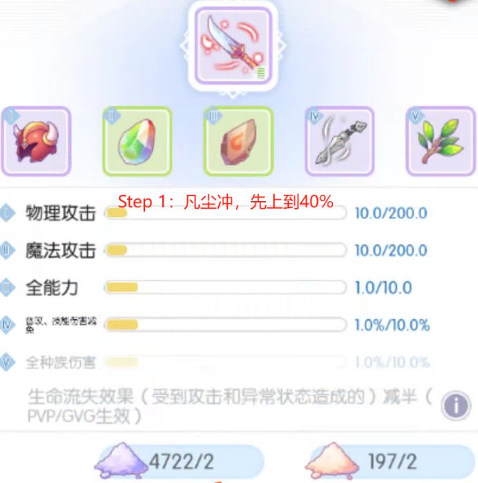 Step1:凡尘单点,快速刷全能力到8以上,百分比数值项进度达到80%以上,物攻魔攻进度达到140以上