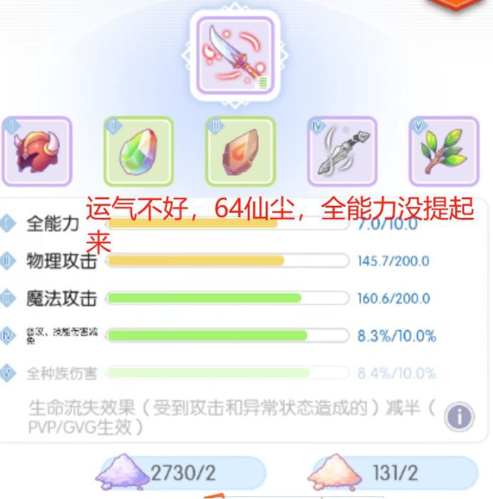 果然,全能力拖了后腿,64仙尘没提升全能力到8,物攻因为开始太低了,导致也没刷上来,严重的风险!