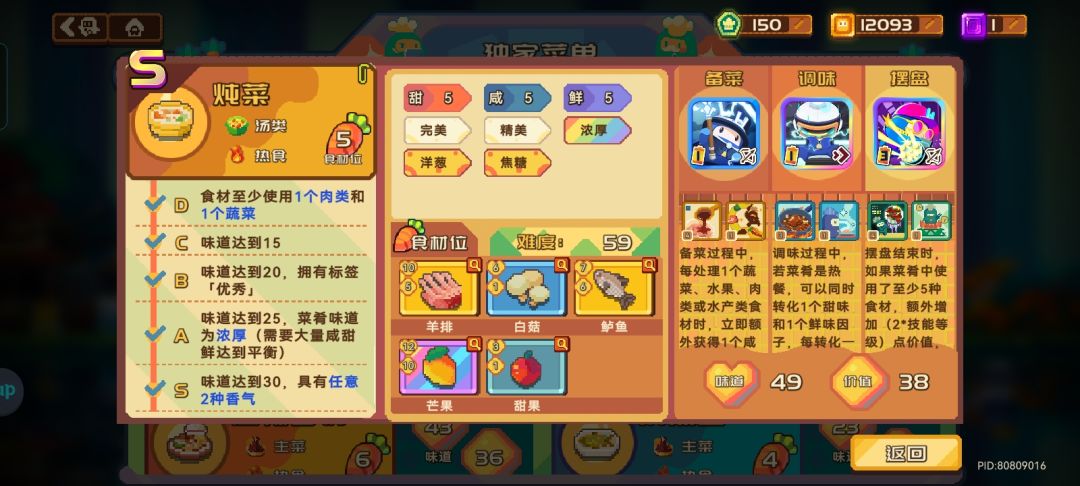 S级炖菜:肉类任意但要注意鲜味总值达到5,水果任意但是要甜味总值达到5(尽量注意搭配)