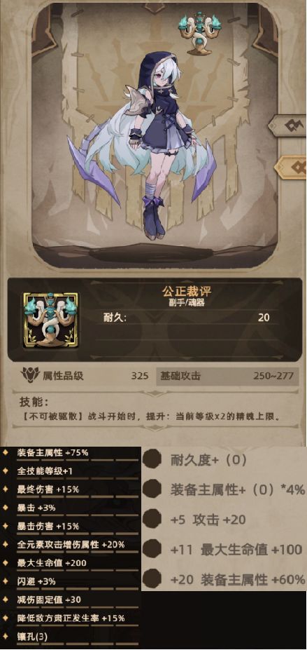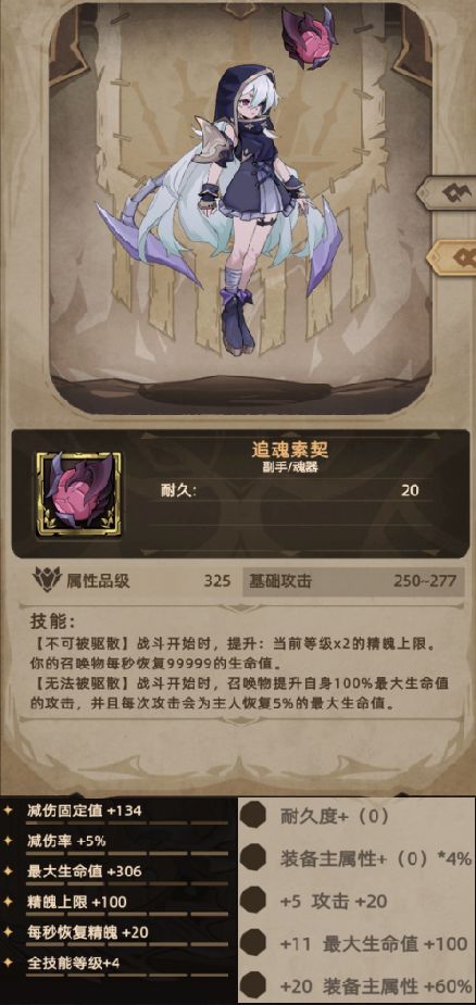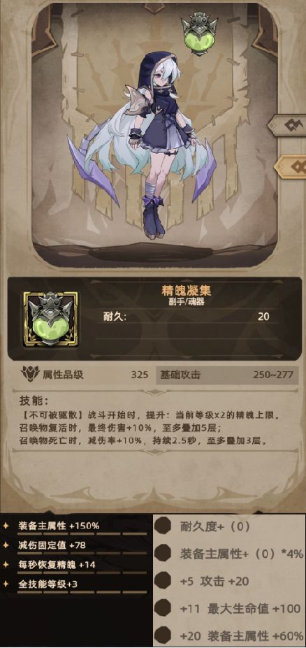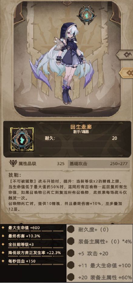 关键词:装备主属性、固定减伤、精魄恢复、全技能等级、条件最终伤害(召唤物复活时)、条件减伤(召唤物死亡时)。