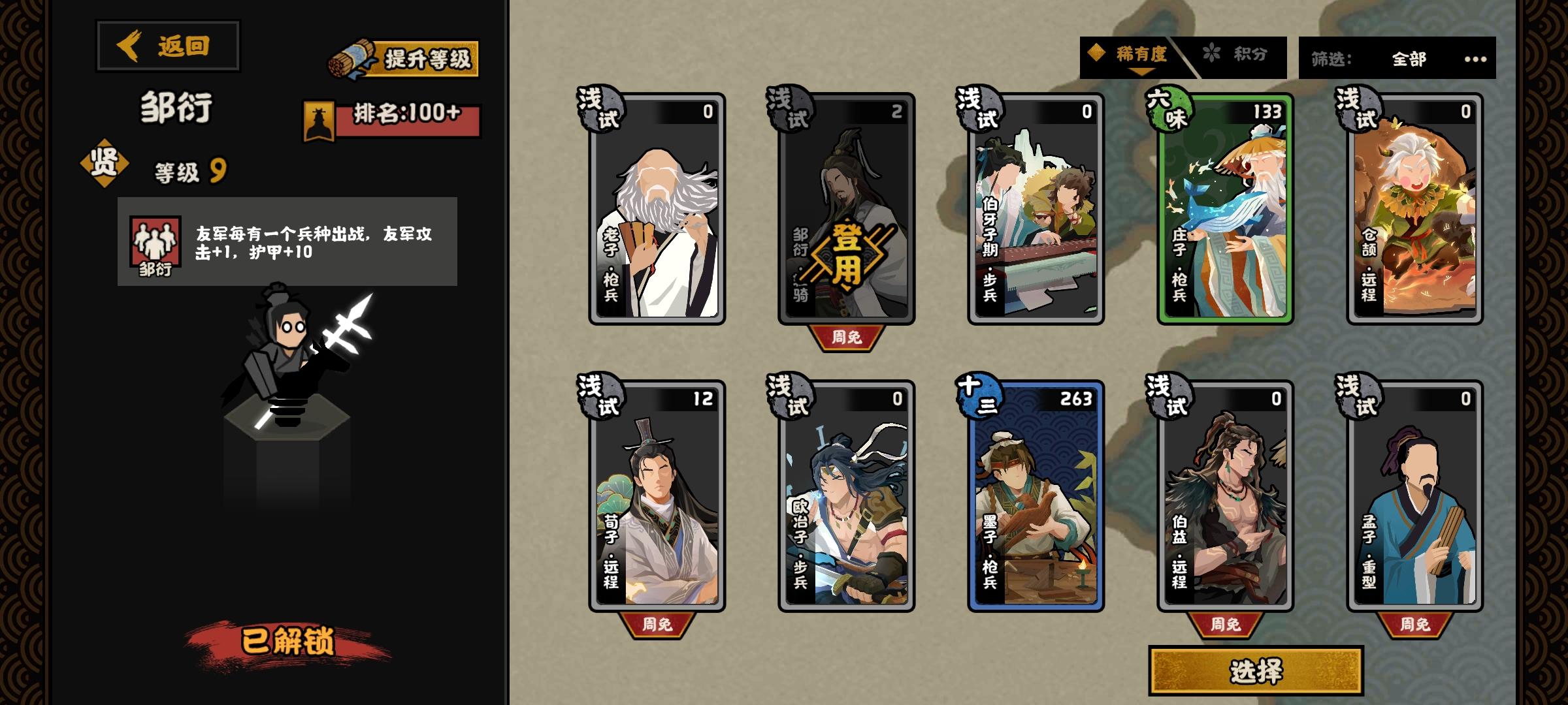 3.防御端:庄子韩信邹衍等加防御在这个阵容不仅覆盖广泛,还有隐性额外收益,即强化并适用于步兵的很多方面,比如士气打击、敌方视角的火力转换难题以及综合配合适应性等。