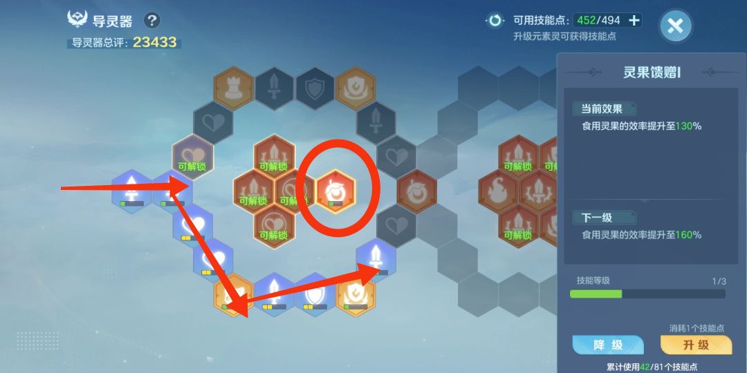 开启灵决技能特殊空格后,继续按照箭头标识的路径一路强化到指定位置的时候,灵果馈赠和灵果盛宴就提升可提升到满级了,然后接着就是把这两个核心技能点满,这两个技能满了以后,元素之灵果子食用的升级效率就是最大化提升了。