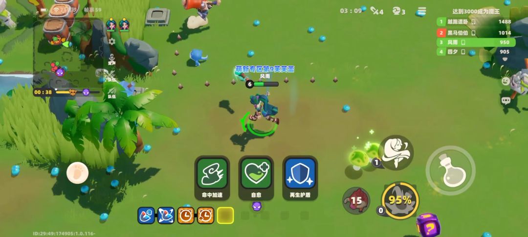 这款游戏主要玩法是3V3V3,捡蓝菇获取经验升级并升级Buff,分数最高的个人对应的队伍获得胜利