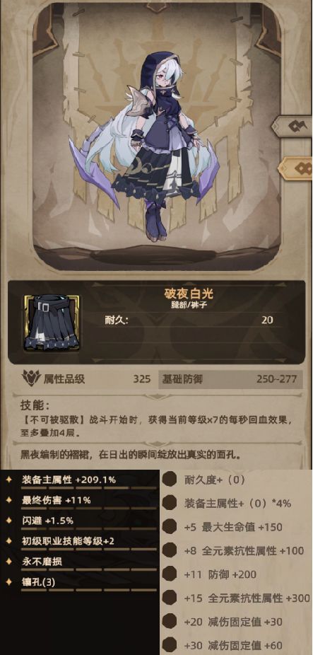 关键词:装备主属性、最终伤害、闪避、初级技能等级、永不磨损、镶孔、生命恢复。
