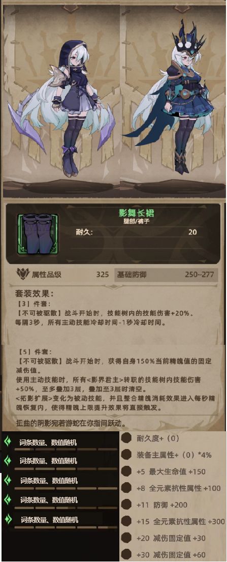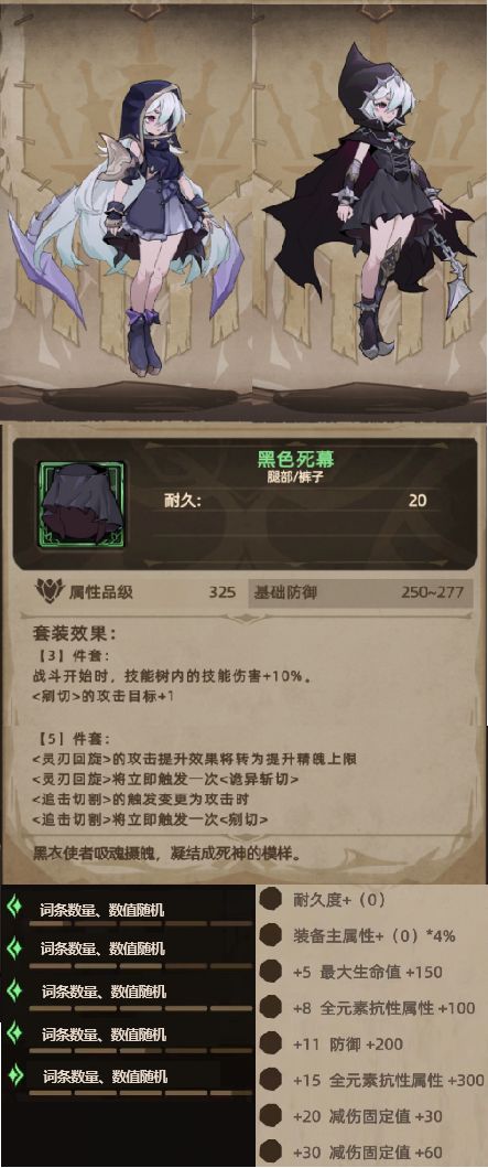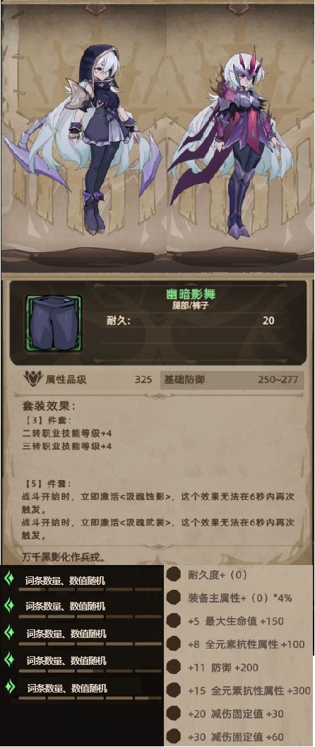 本系列图鉴中,左下方表示装备词条,右下方表示强化属性