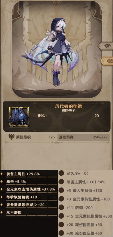 关键词:装备主属性、暴击、元素增伤、精魄恢复、永不磨损。
