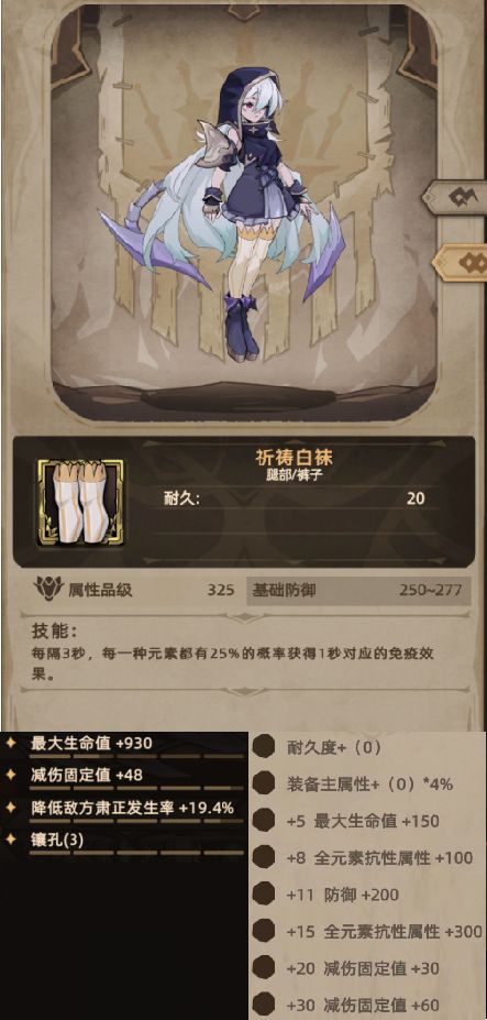 关键词:生命值、固定减伤、降低肃正、镶孔、随机伤害免疫(25%概率随机元素免疫)。