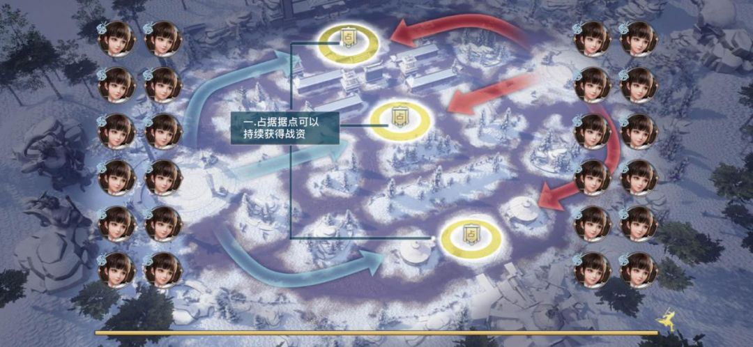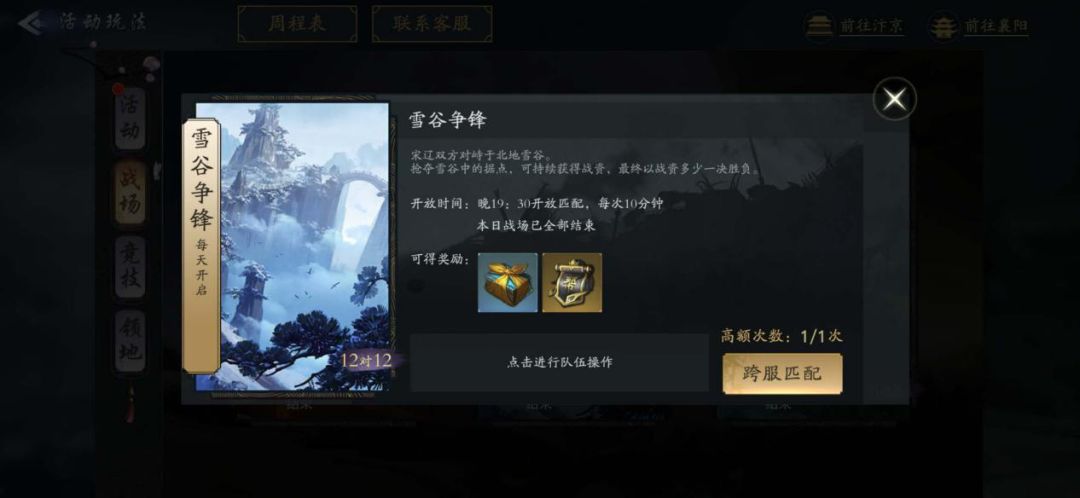 活动描述:宋辽双方对峙于北地雪谷,抢夺雪谷中的据点,可持续获得战资,最终以战资多少一决胜负。