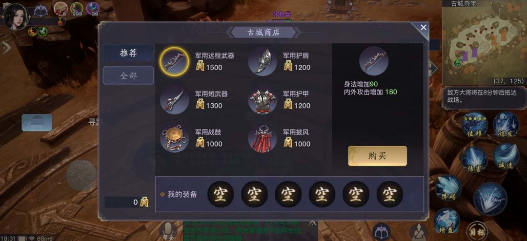 战斗开始后,双方都会定时刷新出小兵赶往战场进行战斗,击杀敌方小兵可以获得古币,击杀野外的盗匪也可以获得古币,古币可以在古城商店购买临时的战场装备。装备增加的属性不同,需要根据自己的流派来选择合适的装备。