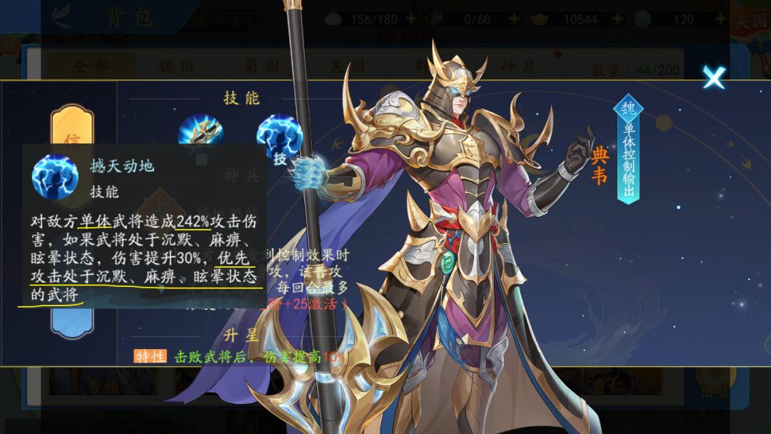 典韦的技能为对目标单体造成大量伤害,优先锁定被控制目标,适合在张辽之后进行补刀,补充魏国比较缺乏的伤害。