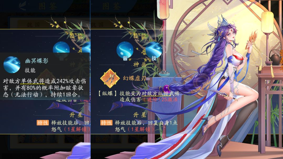 技能和神兵+25的效果提升图并且张春华的技能不同于郭嘉,拥有80%的基础概率,搭配曹植2星时解锁的光环,基本上能实现百分百控制。可以先手破神技瑶光清辉曲,让郭嘉接上控制。