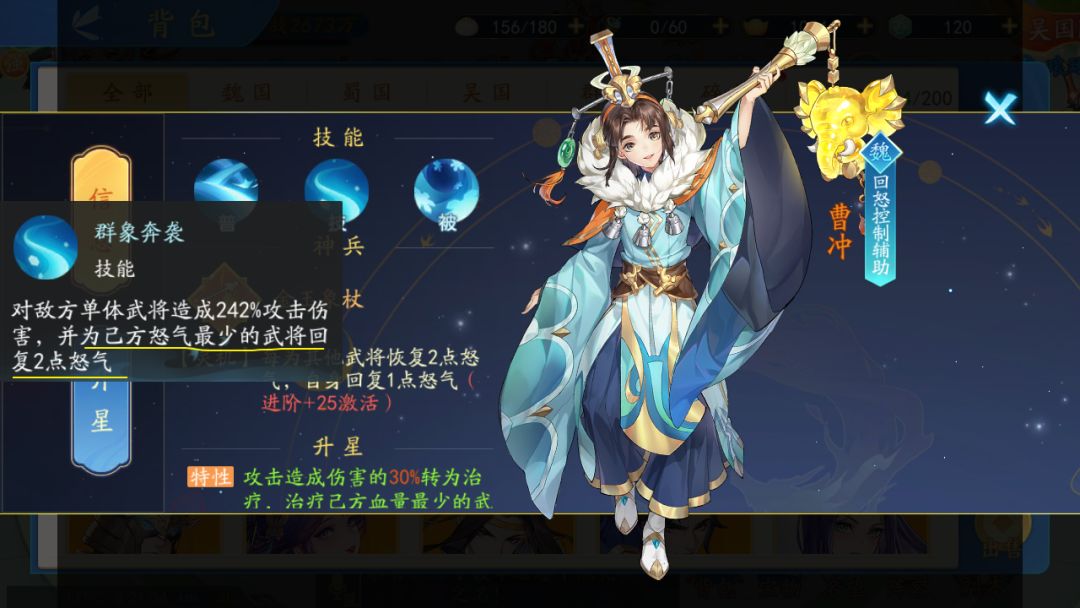 等到开服20天之后,会有无双武将活动,这时候我们就可以弄到我们的辅助大哥:曹操曹老板。曹操的技能跟曹植类似,可以在对方被控制时扣除2点怒气,可与曹植叠加,所以等我们曹操2星以上时,可以换下曹冲。如果出了魏国限定武将,可换下典韦或者张辽。等到第二个月,魏国无双第二个武将荀彧问世之后,可以换下张春华。