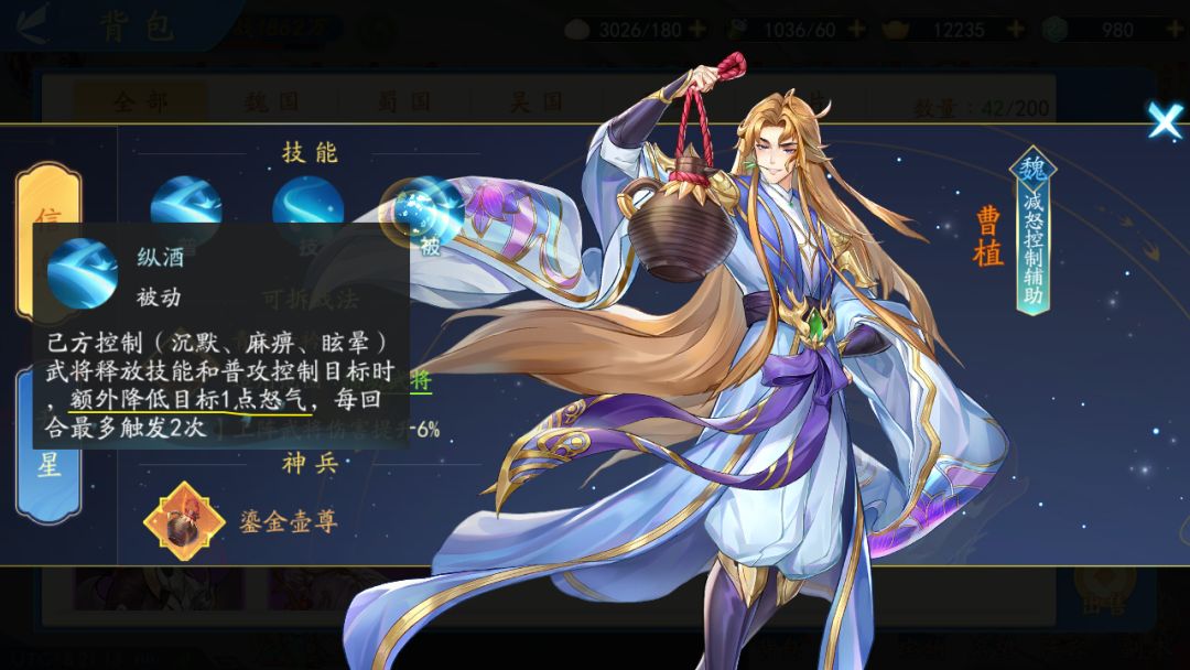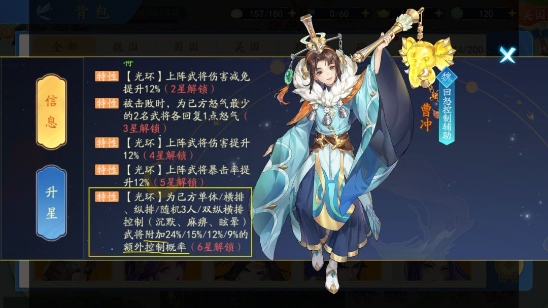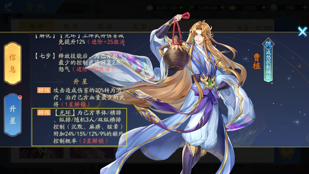 曹植的亮点在于升到2星时,曹植会解锁概率光环(如下图所示),可以给郭嘉加成控制概率。