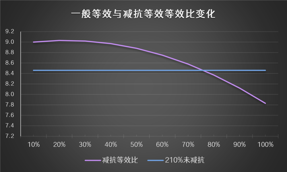 4.减抗的等效血量不比等效血量低,在高抗下,通常减抗等效都会比正常等效血量高很多,因为减抗的分子变小,分母升高,整体就高:需要减去很高的抗性方能使其低于正常等效血量。