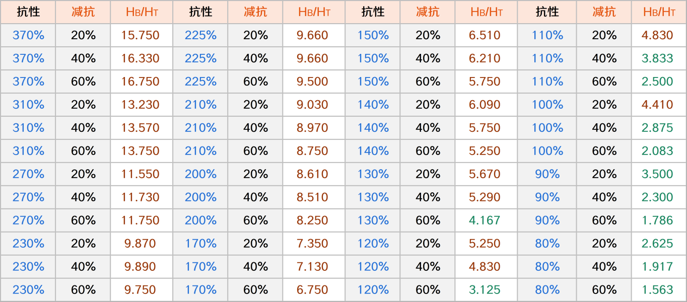 (表中不同颜色的数字代表抗性的不同分段)不同减抗情况下,也能看出等效比的总体趋势: