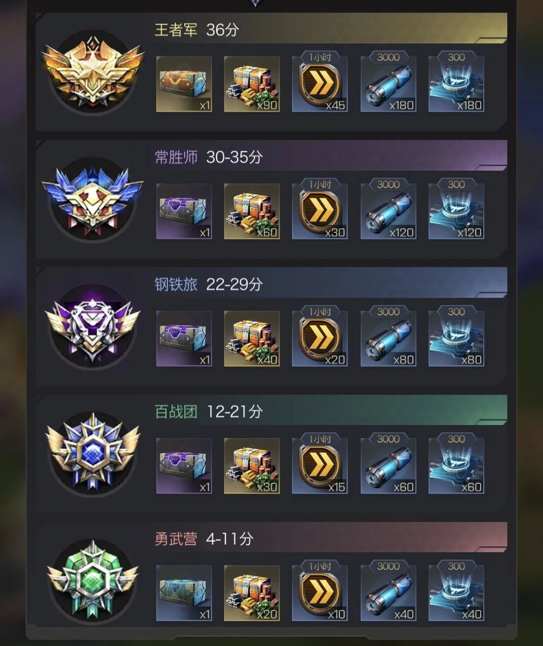 除此之外,每个赛季结束时会根据联盟战区积分进行段位结算和奖励发放,不同段位具体分数与奖励如下图。