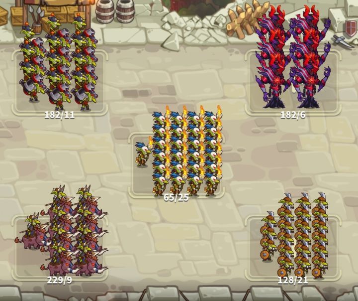 如图所示开局培养五个军团分别为:炮兵小队(炮)、暗黑影魔(影)、哥布林预言者(预)、哥布林骑士(猪骑)、哥布林勇士(勇)