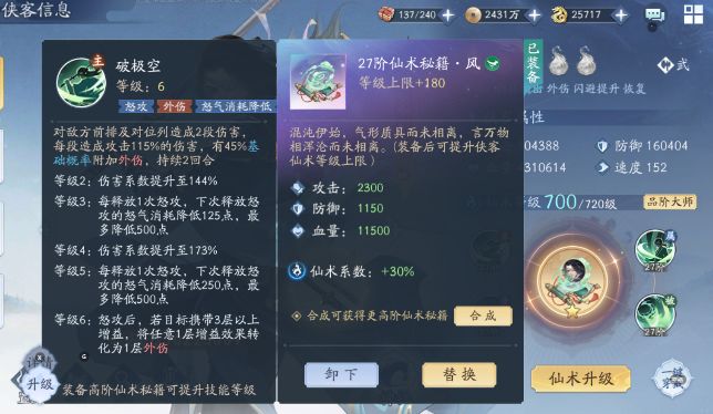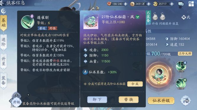 点评:对于其他侠客而言这个属性提升很多都是中规中矩的,但是对于越今朝这个侠客就相当特殊,可以增加30%闪避面板,这个闪避可以让越今朝闪避的概率有了质的变化,也就是这个特性,需要给越今朝第一时间27仙术。