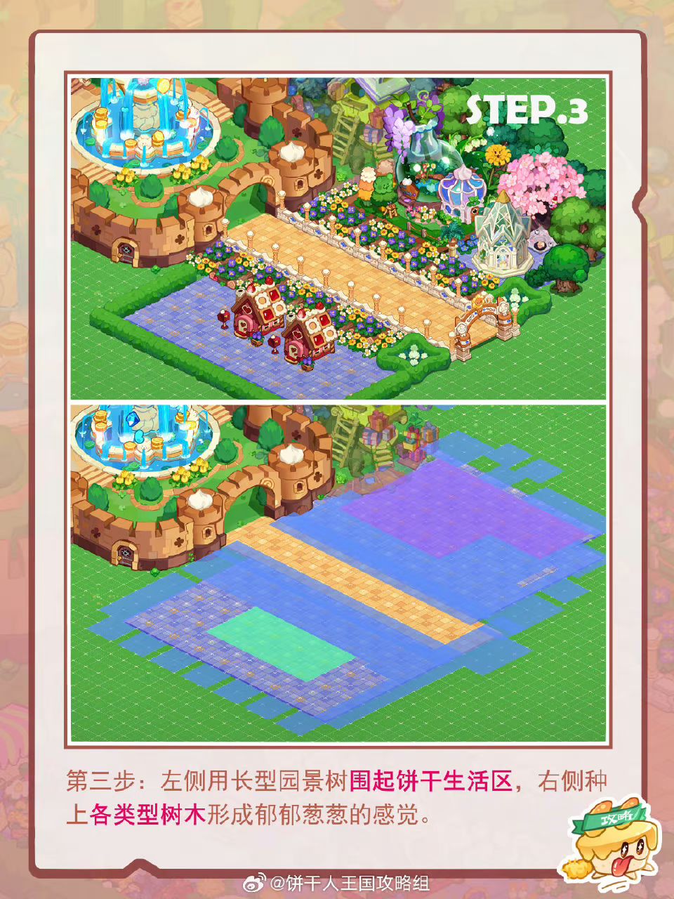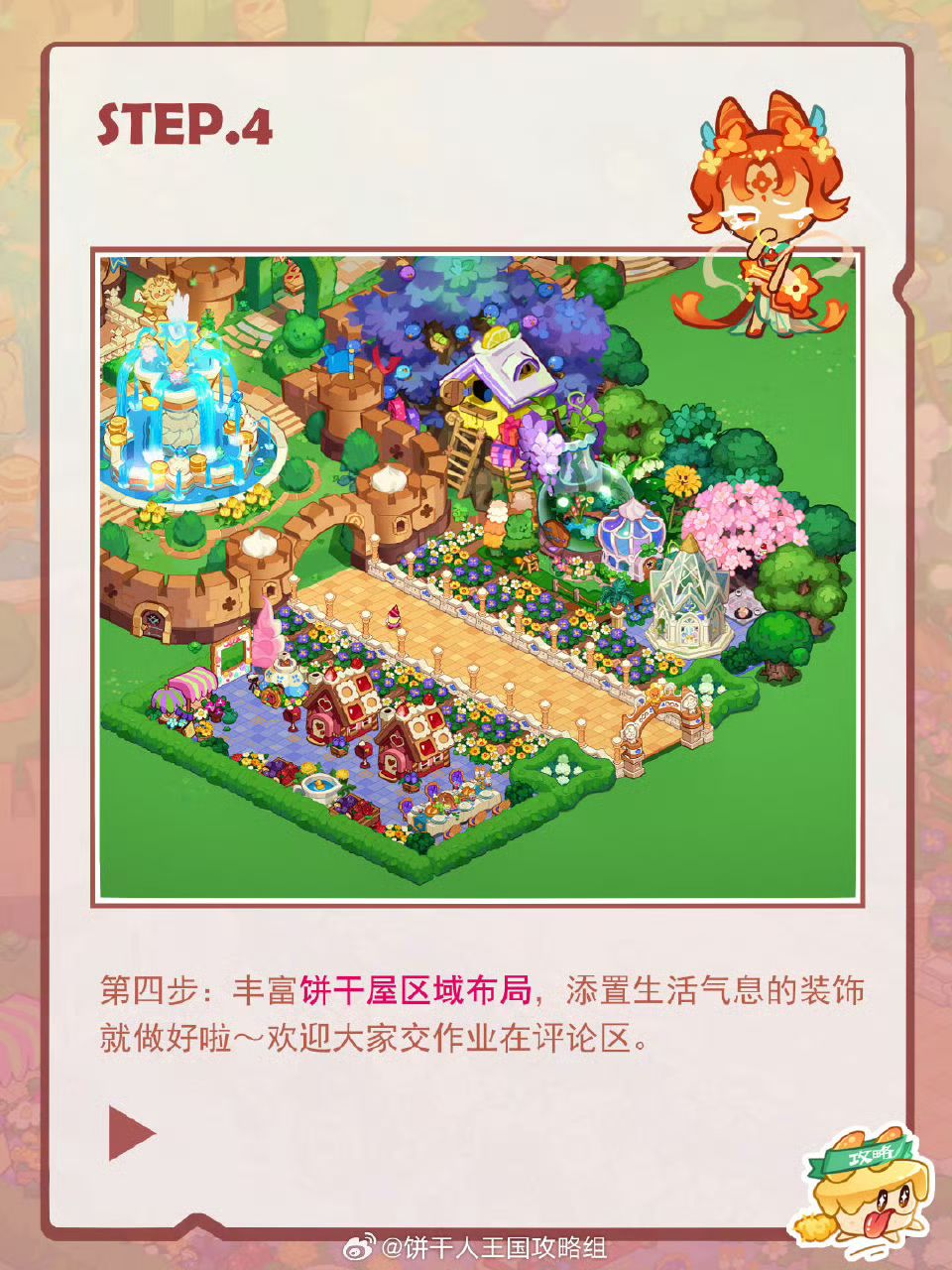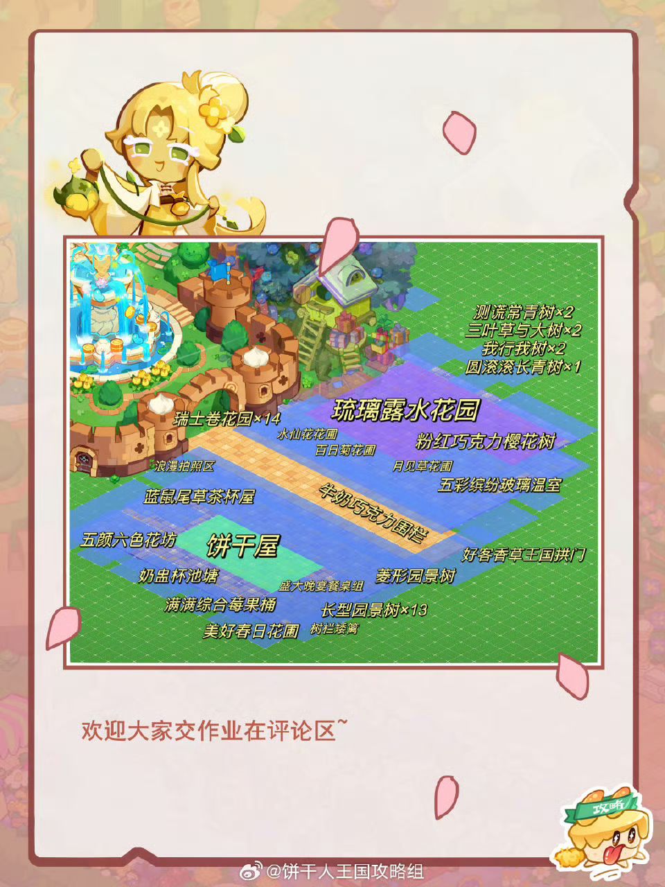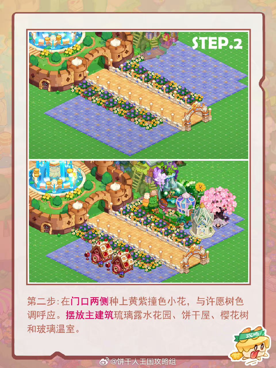 在许愿树旁边搭配了芬芳绮丽的景色,让饼干王国门口之路春色熙熙,开启香甜蓬松的大陆,和饼干们一起踏上绘香之旅。
