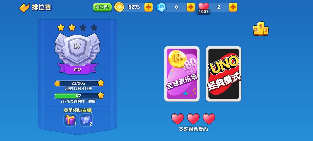 今天刷短视频发现uno牌,突然好想玩一下就下载了,打完新手教程跟几把经典,解锁了竞技模式后,一连好几把排到这个队友,就拉他一起打,结果一直连胜,最高13连胜吧,然后断了几把,一直玩到50局上限,现在有5k金币,段位也来到了白银IV,哈哈哈,是不是天胡开局
