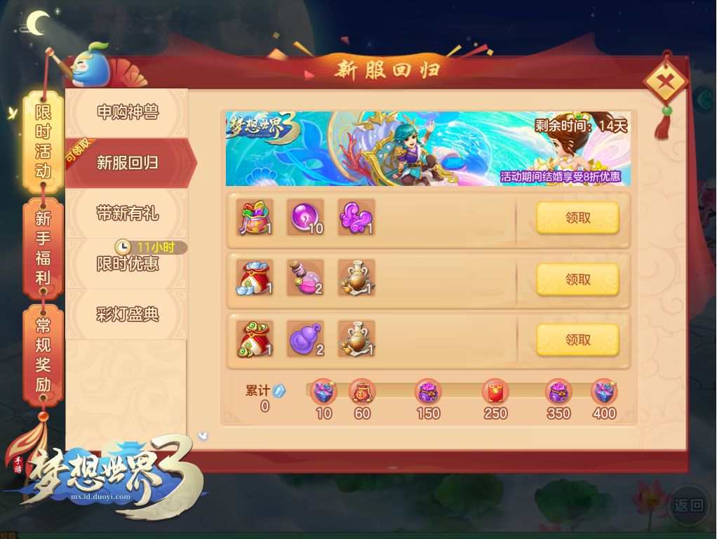 新服开服前4周开启在线礼包活动,活动期间内当天累计在线5分钟、15分钟,可各获得1份在线礼包。每天首次登录时刷新,最多领取3天奖励。