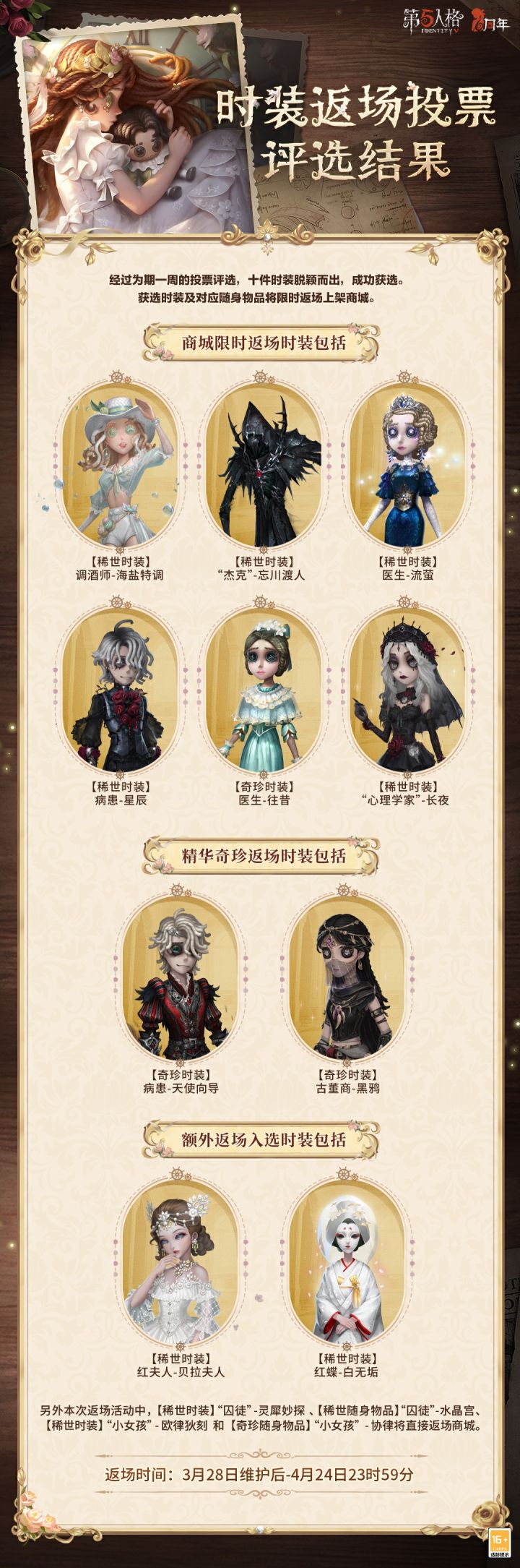经过为期一周的投票评选,10件时装脱颖而出,成功获选。获选时装及对应随身物品/随从/动作将限时返场上架商城。