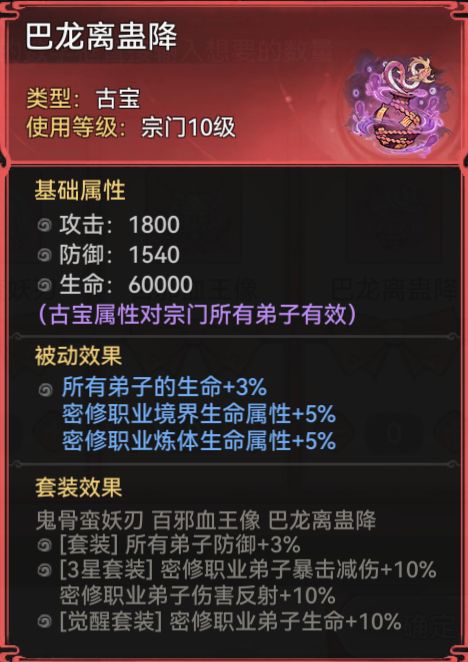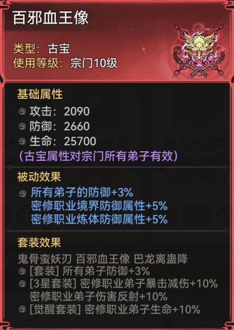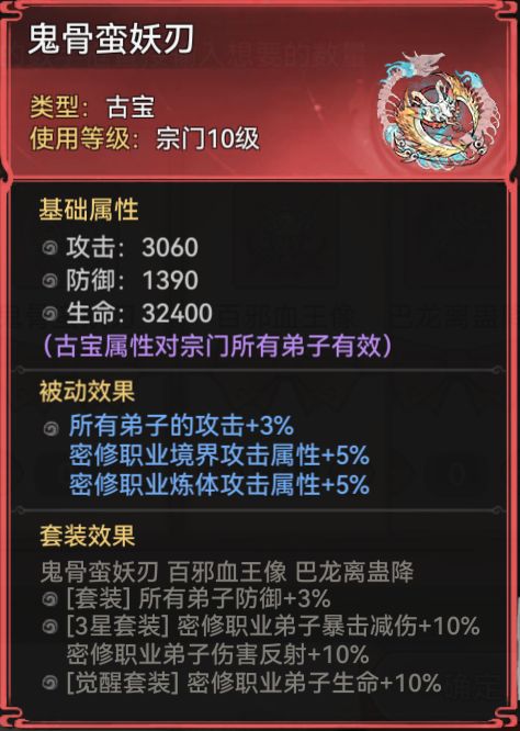 本期现世的仙宝有3个,分别是鬼骨蛮妖刃、百邪血王像、巴龙离蛊降。