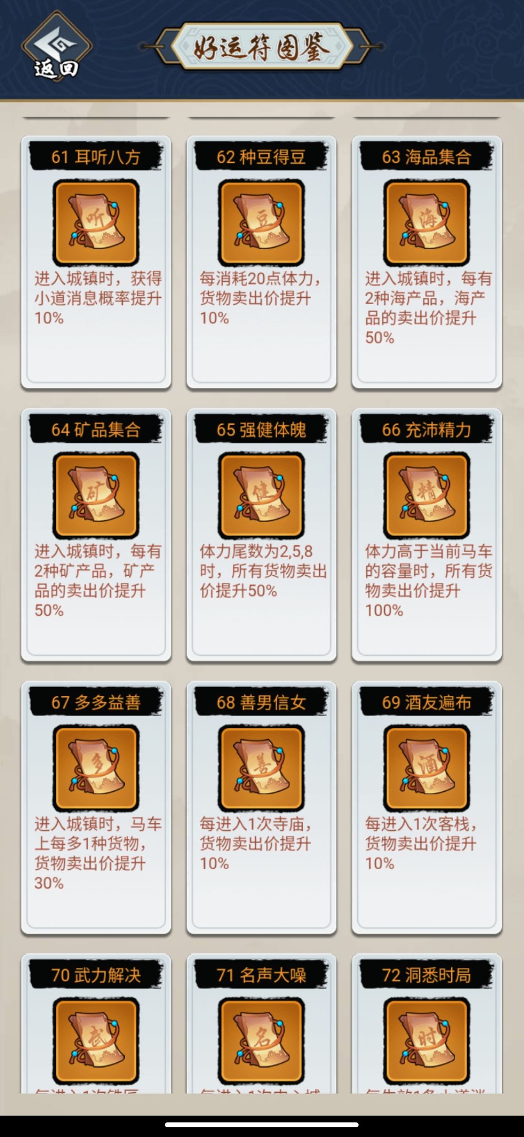 3.几个特殊地点,铁匠铺是进行马车的维修和扩容,客栈是买体力和小道消息,运气不好,可能体力买不到。寺庙是买稀有好运符。我开头为什么说跑商想拿50万容易,但是拿名次难,因为名次需要好运气,运气体现在你能不能碰到稀有的好运符,大家可以查看好运符的各种效果,然后互相搭配,各个城市有一些领队,解锁这些领队和获得相关好运符,才可以让你起飞。用不完的体力,永不破损的马车,超大的容量,超高的利润加成,这些才是上榜的秘诀。