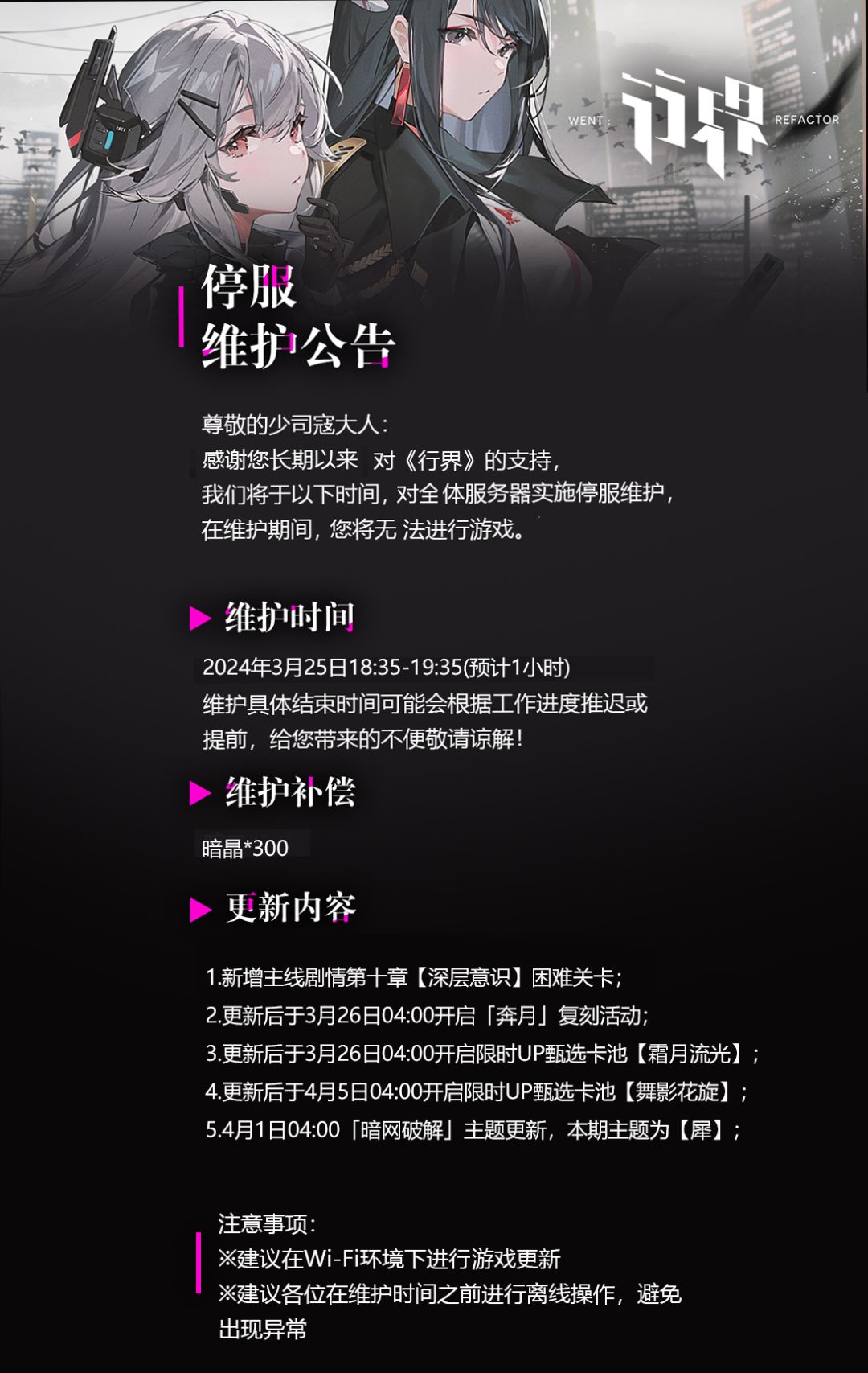 感谢您对《行界》的支持,我们将于以下时间,对全体服务器实施停服维护,在维护期间,您将无法进行游戏。