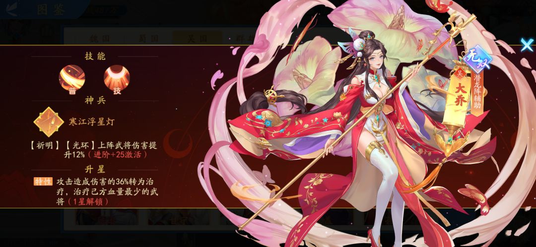 大乔可以进行替换,舍弃辅助大乔用输出孙策,虽然少了一个辅助不能一回合解锁陆逊三次,但孙策的加入使吴国战前伤害能力大大提升!且孙策吃到了版本红利输出能力大幅提升。升星后技能由单后横排变为双横排,并且+50神兵后人越少打的越疼。虽然改版后与那些极致的输出武将还有一定差距(诸葛,张辽等);