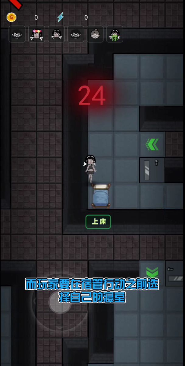 游戏开局会有宿管闯进宿舍楼,而玩家要在宿管行动之前选择自己的寝室然后躺者是的就是躺着,当然只是我们操控的角色要躺着,而作为玩家的我们就要建设好自己的寝室抵挡宿管的袭击。