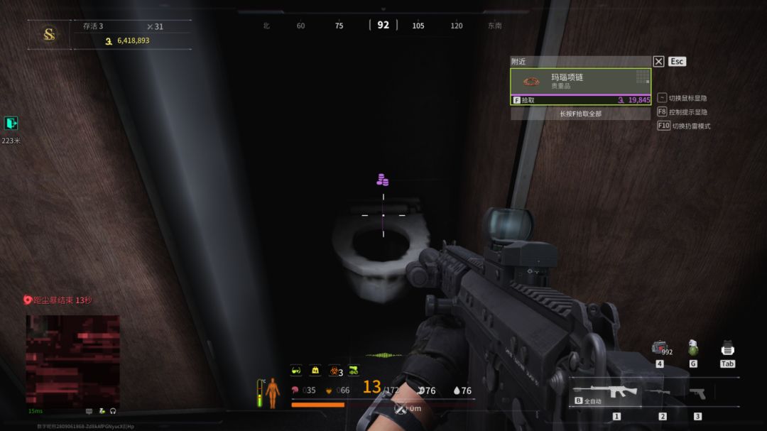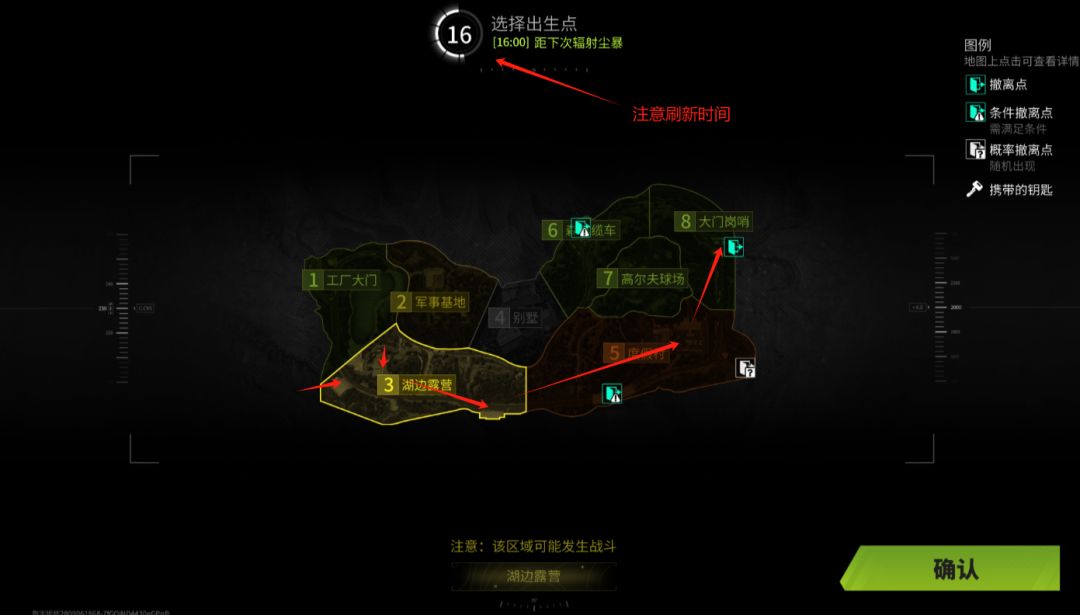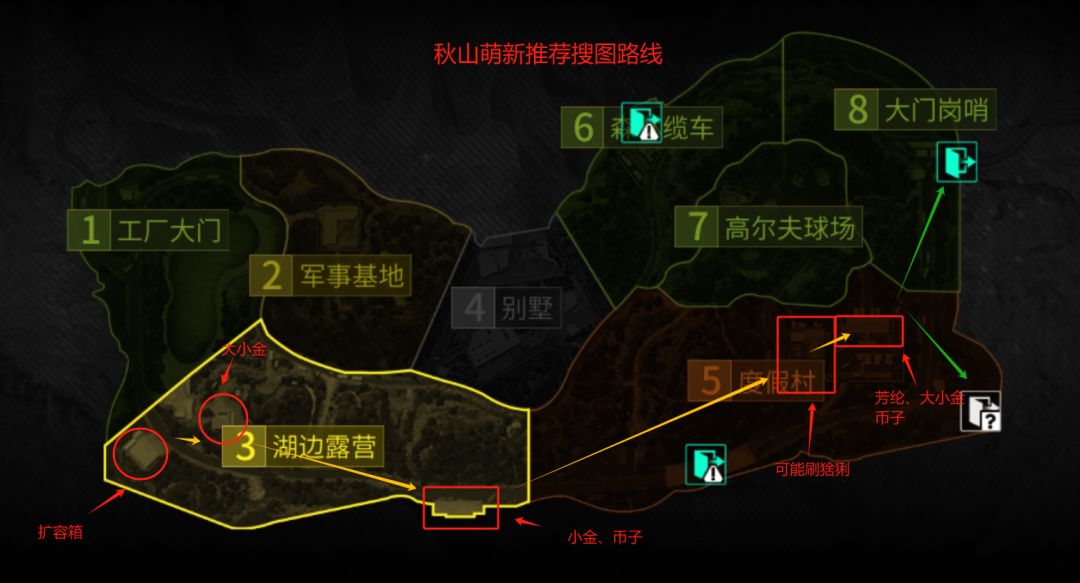 秋山主要出金点位在别墅和度假村,别墅都是高手玩家和猞猁小队,附近还会刷莱昂斯,所以推荐萌新按照以下路线搜图。开局时如果下次尘暴时间为13分钟,则意味着这是一局新局,局内暂时没其他玩家,可以大胆搜索。