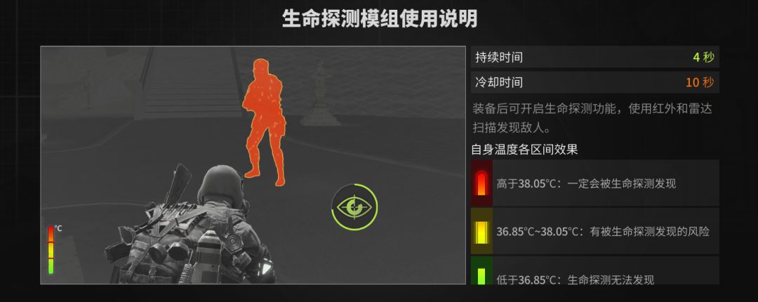 战术目镜携带生命探测模组较好。在游戏中,我们可以在状态栏看到自己的体温。跑步,行走,跳跃等动作都会使我们升温,静步和静止不动则可以降温,在对局中使用生命探测模组技能进入红外监测后,如果一定范围内的敌人体温较高,就可以探测到并显示具体位置,而在秋山赶路的对局中,大多数人都是在橙色温度以上的,有概率会被探测到具体位置。